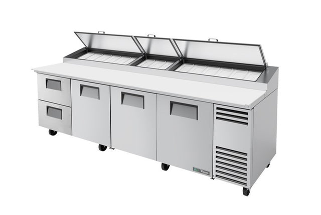 True’s pizza prep tables are designed with enduring quality that protects your long term investment. Factory engineered, self-contained, capillary tube system using environmentally friendly R290 hydro carbon refrigerant that has zero (0) ozone depletion potential (ODP), & 0.02) global warming potential (GWP). High capacity, factory balanced environmentally friendly forced-air refrigeration system holds 33°F to 41°F (.5°C to 5°C). NSF/ANSI Standard 7 compliant for open food product. All stainless steel front, top and ends. Corrosion resistant GalFan coated steel back. Stainless steel, patented, foam insulated flat lids keep pan temperatures colder, lock in freshness, and minimize condensation. Interior – attractive, NSF approved, clear coated aluminum liner. Stainless steel floor with coved corners. Extra-deep 19–1/2" (496 mm) full length removable cutting board included. Sanitary, high density, NSF approved white polyethylene provides tough preparation surface. Heavy duty, PVC coated wire shelves (door sections). Each drawer accommodates two (2) full size 12"L x 20“W x 8"D (305 mm x 508 mm x 204 mm) pans (sold separately).